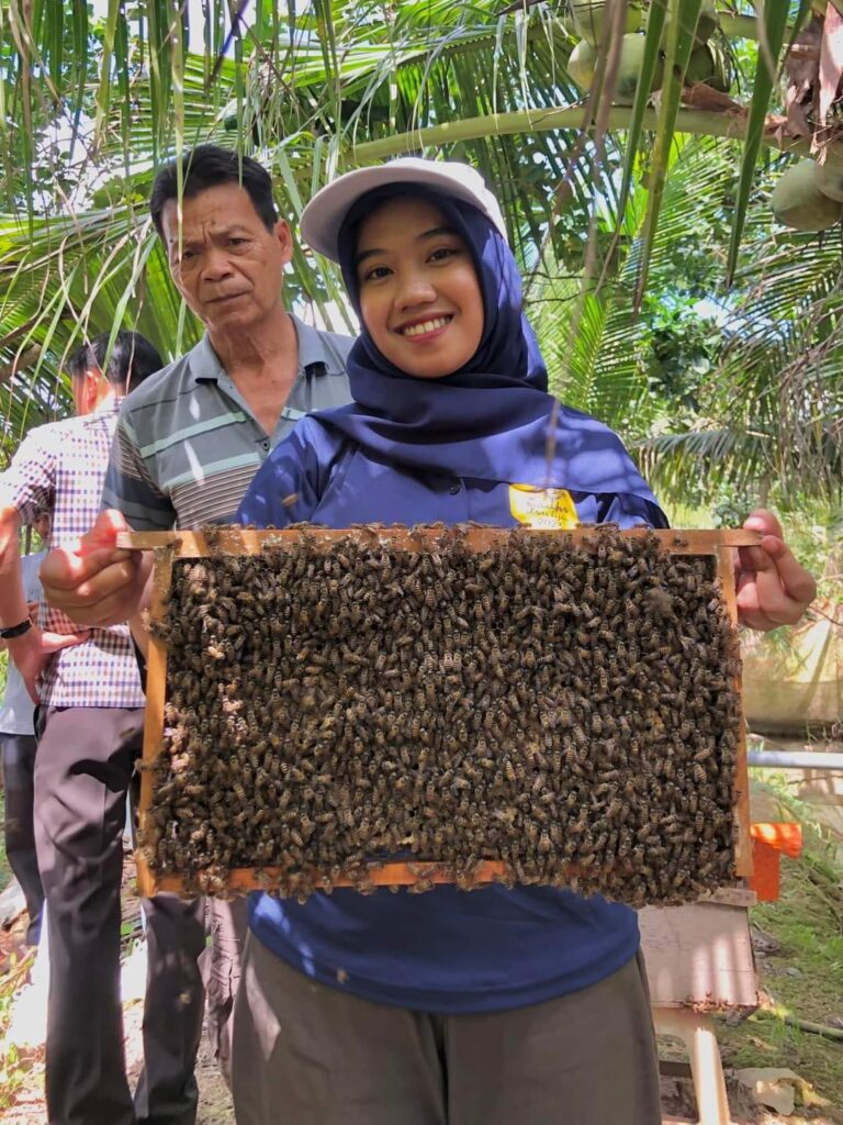 Hari terakhir Madhu Duniya dilakukan kunjungan lapangan ke lokasi peternakan lebah komersial A. cerana di provinsi Tien Giang Vietnam. Dimana Juswati belajar spesies Apis cerrana, lebah yang dibudidayakan di Bee-Keeping Site. Dimana memiliki koloni lebih kecil, satu koloni Apis cerana berisi sekitar 6 ribu hingga 7 ribu lebah pekerja. “Madu cerana disini sering disebut, coconut bee,” ujar Wati, dara yang sedang menyelesaikan S2 Agribisnis di IPB Bogor ini.