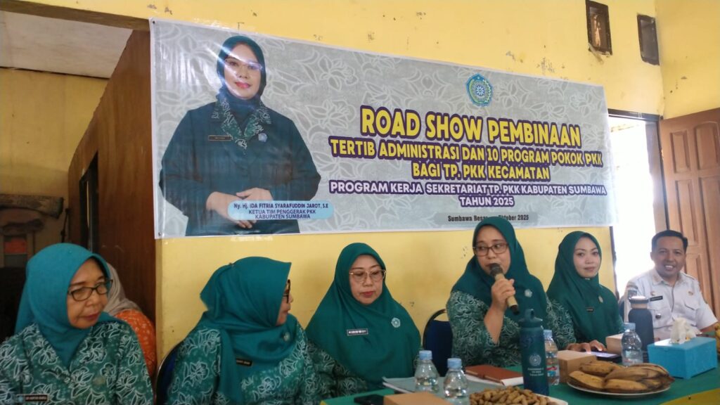 Tim Penggerak PKK Kabupaten Sumbawa terus memperkuat kapasitas kelembagaan hingga ke tingkat kecamatan. Melalui kegiatan Roadshow Pembinaan Tertib Administrasi dan 10 Program Pokok PKK, Ketua TP PKK Kabupaten Sumbawa, Hj. Ida Fitria Syarafuddin Jarot SE, memimpin langsung kegiatan pembinaan yang digelar sejak 16 hingga 24 Oktober 2025 di lima kecamatan, yakni Utan, Lenangguar, Batu Lanteh, Lopok, dan Labuhan Badas.